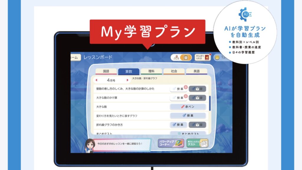 | 個別プラン | 教科書・理解度に応じてAIがおすすめ学習内容を提案 |