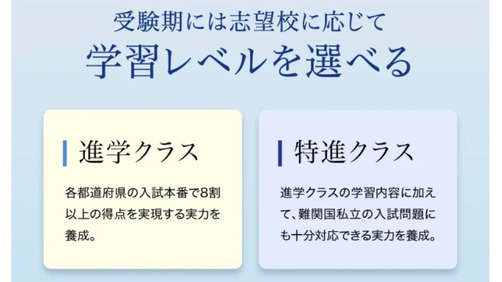 - 特進クラス:進学クラスの内容に加えて、難関国私立の入試問題にも対応できる実力を養成。