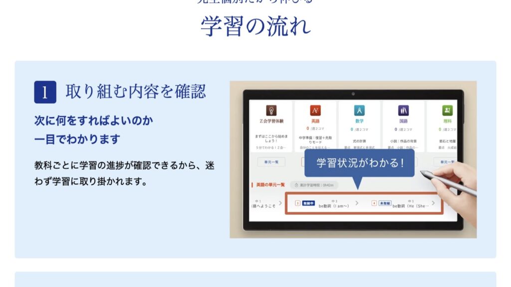 Z会はタブレットのみで学習するサービス。タブレットでZ会のアプリ(学習サイト)を開き、映像授業や確認問題、添削指導などを使って勉強する。