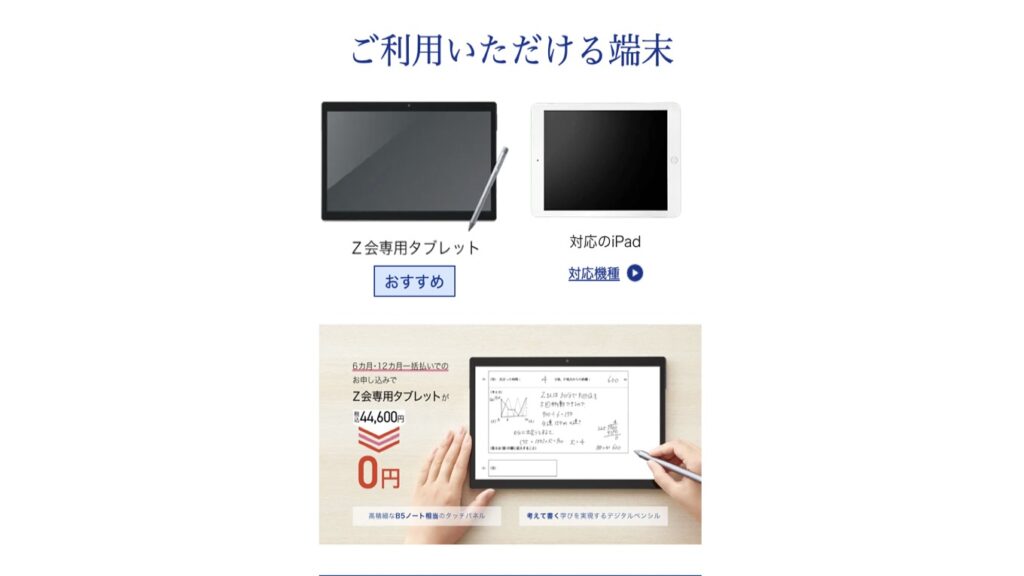 Z会は専用タブレットとiPadの両方に対応していて、「iPadを使いたい」というニーズにも応えている。これは進研ゼミとスマイルゼミにはない利点。進研ゼミとスマイルゼミは専用タブレットしか使えない。