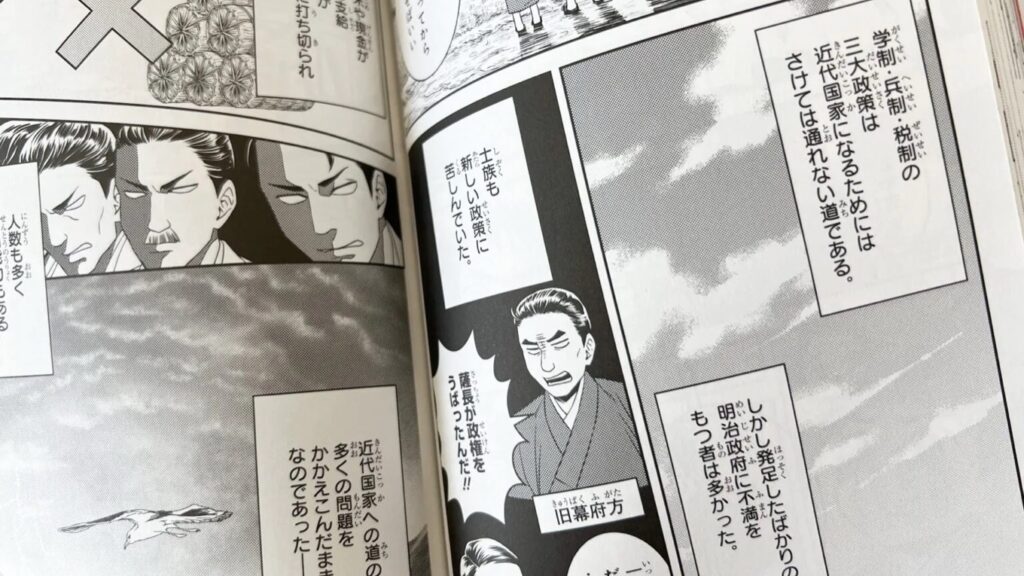 集英社の漫画は日本の歴史の中で超大事な部分、本質的な部分を伝えることを強く意識して作られているという印象。ただ歴史的事項を大量に羅列したり、大量のテキストで説明過多になったりしないように注意して、「マンガとして楽しめる適切なボリュームで、歴史の核心を突こう」みたいな感じ。