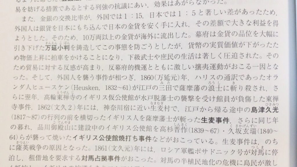 例えば、江戸時代末期に開港した影響について書かれている部分。金銀の交換比率が海外と日本とでちがったことから、日本の金が海外流出した話が書かれているのですが、