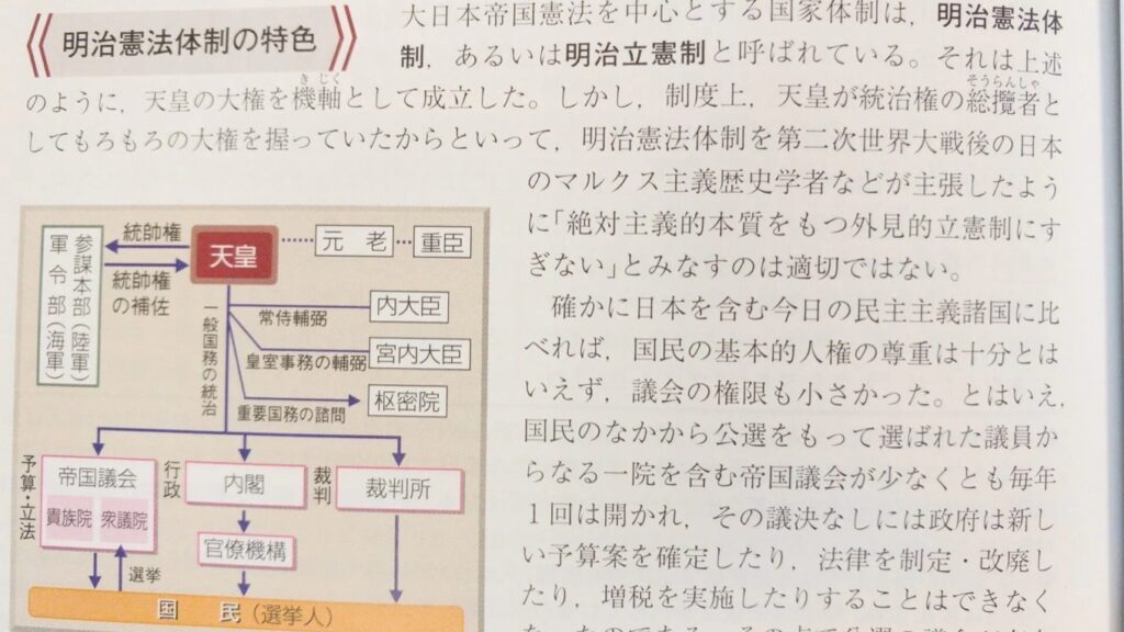 また、明治憲法(大日本帝国憲法)の話では、その特色がかなりわかりやすく丁寧に書かれています。