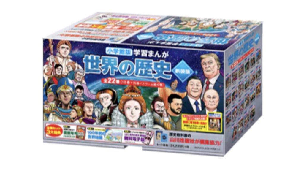 2024年にリニューアルされた、いま最も新しい世界の歴史の学習漫画。他の学習漫画の良い点を取り入れつつ、課題だった部分を改善して作られている。他社製品と比べても値段が安めで、コストパフォーマンスがいい。